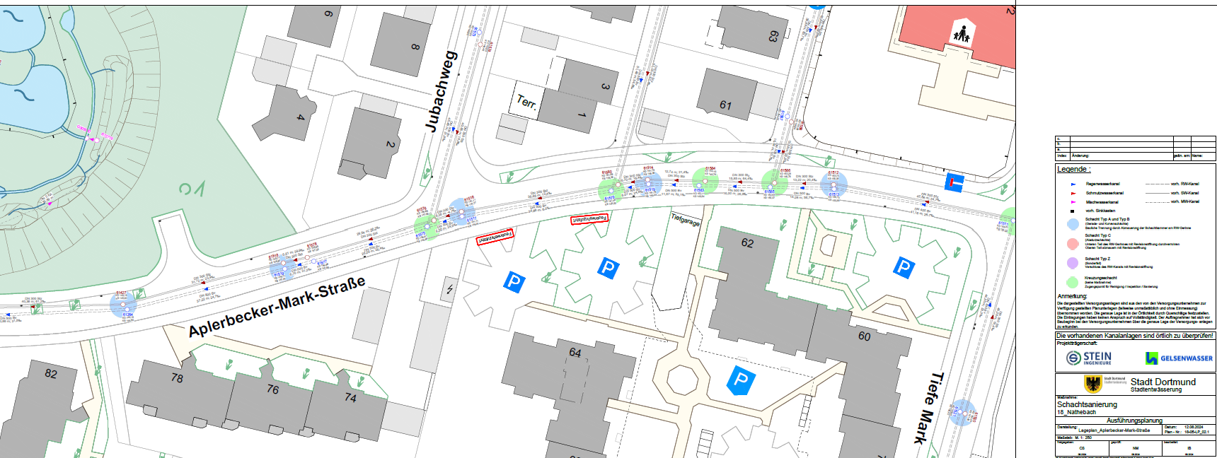 (Beispiellageplan aus dem Abschnitt Aplerbecker-Mark-Straße / Jubachweg. Umgebaute Schächte in Blau markiert)